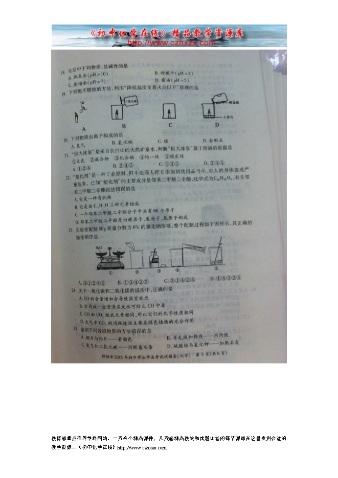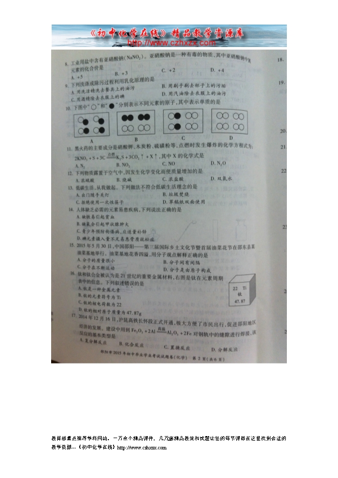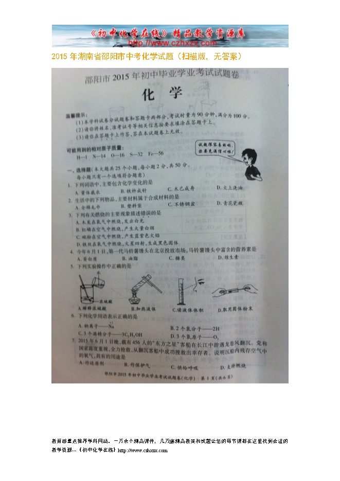 2015年湖南省邵阳市中考化学试题(扫描版,无答案)