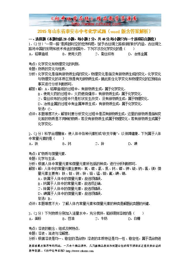 2015年山东省泰安市中考化学试题(word版含答案解析)