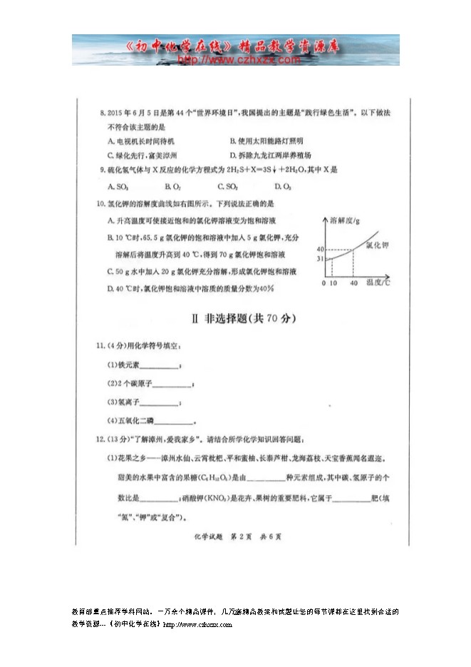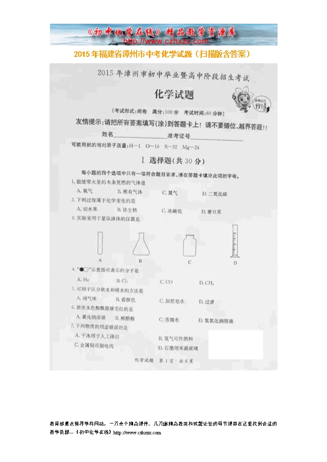 2015年福建省漳州市中考化学试题(扫描版含答案)