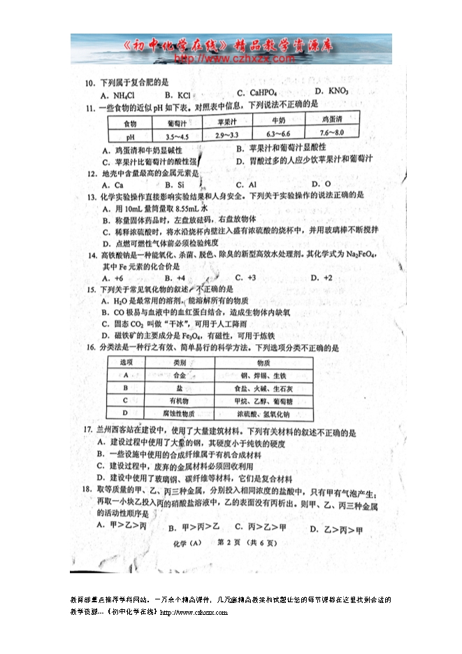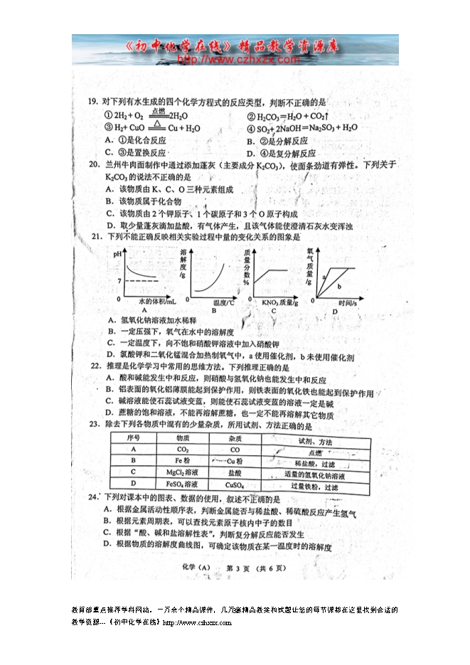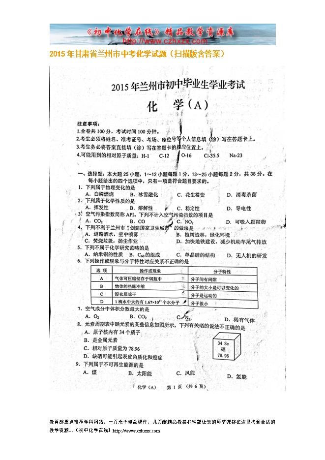 2015年甘肃省兰州市中考化学试题(扫描版含答案)