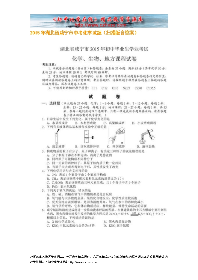 2015年湖北省咸宁市中考化学试题(扫描版含答案)