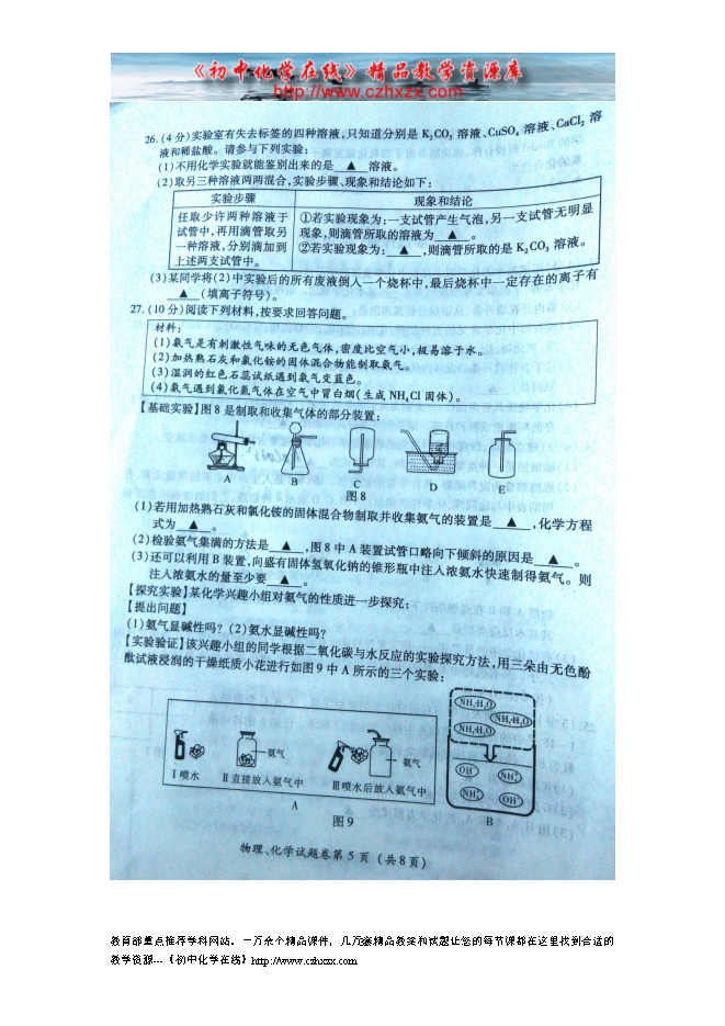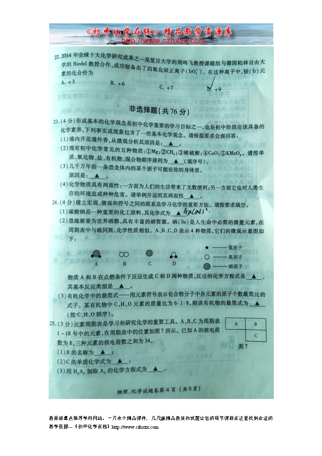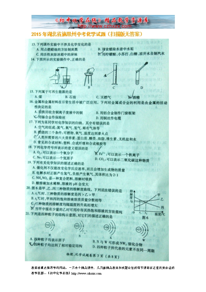 2015年湖北省施恩州中考化学试题(扫描版无答案)