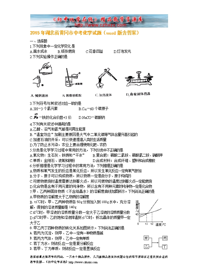 2015年湖北省黄冈市中考化学试题(word版含答案)