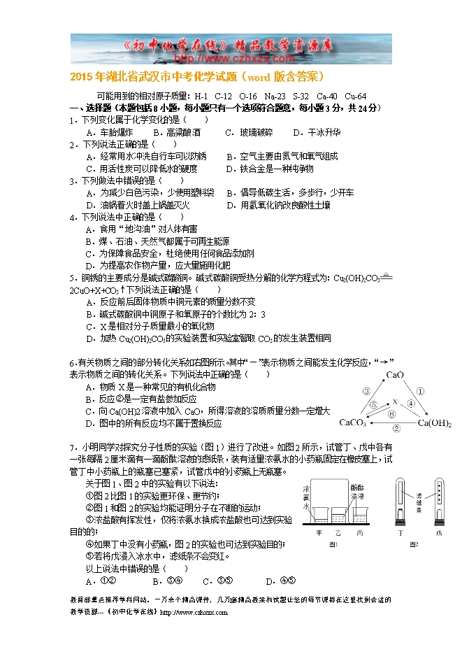 2015年湖北省武汉市中考化学试题(word版含答案)