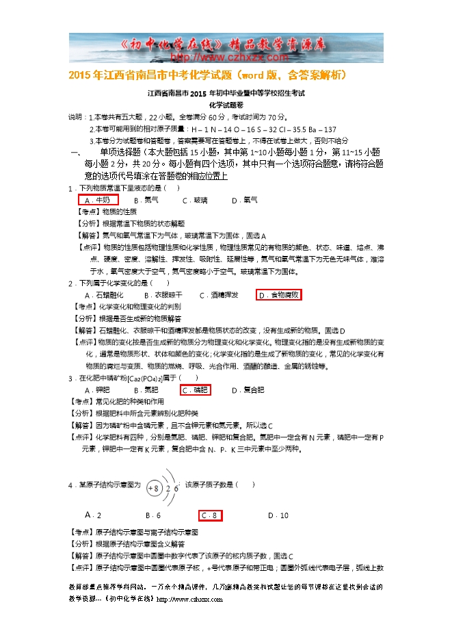 2015年江西省南昌市中考化学试题(word版,含答案解析)