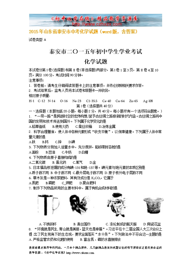 2015年山东省泰安市中考化学试题(word版,含答案)