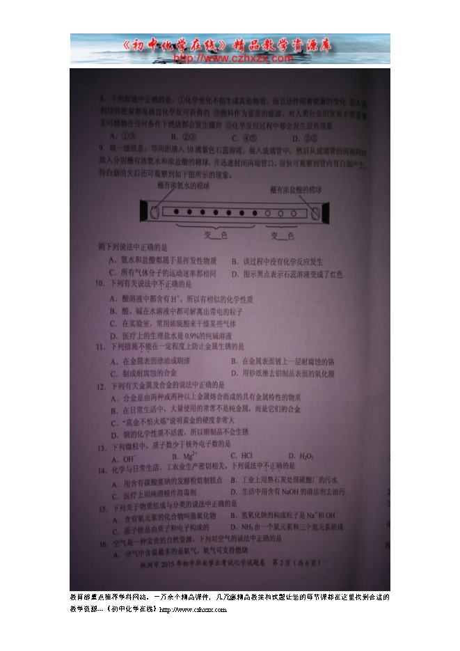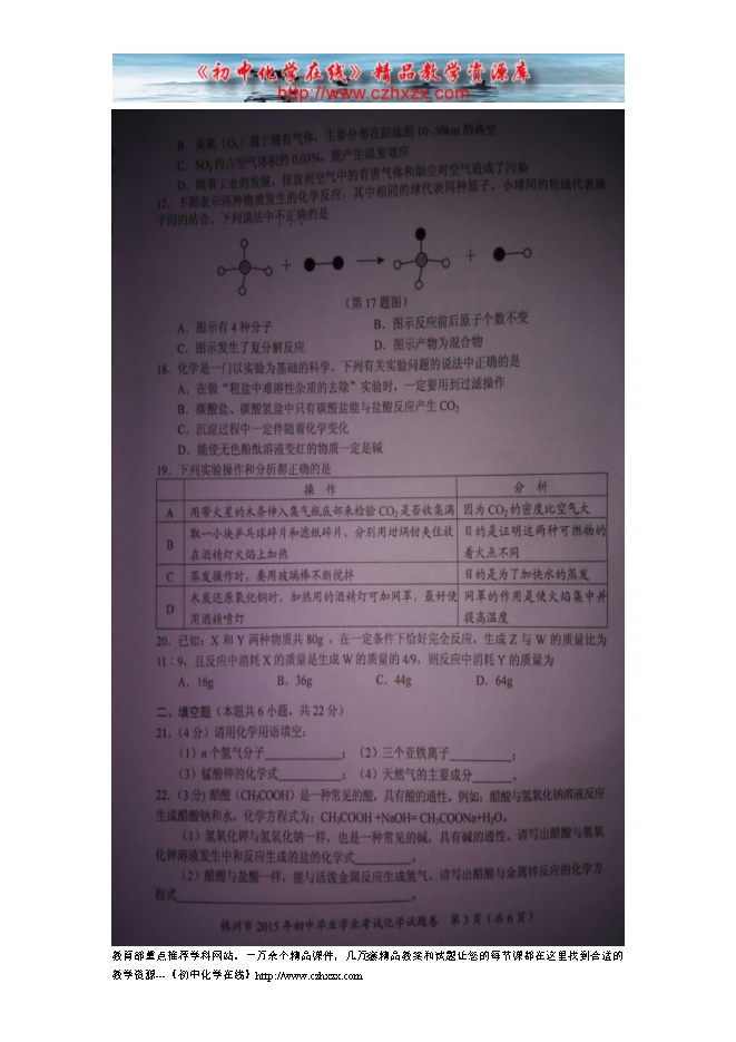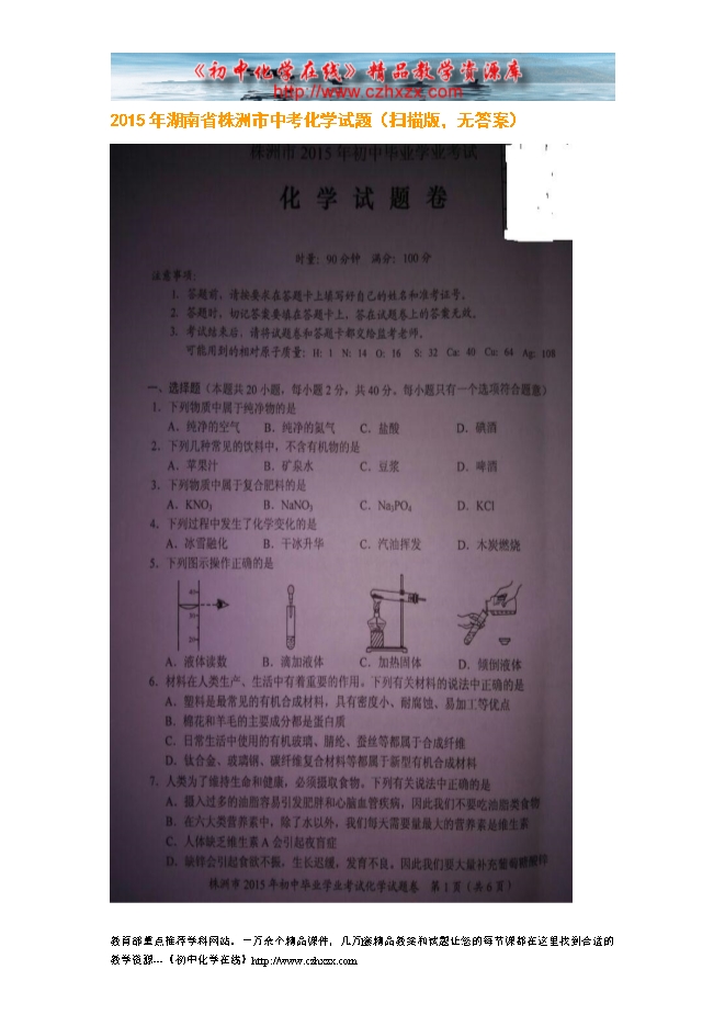 2015年湖南省株洲市中考化学试题(扫描版,无答案)
