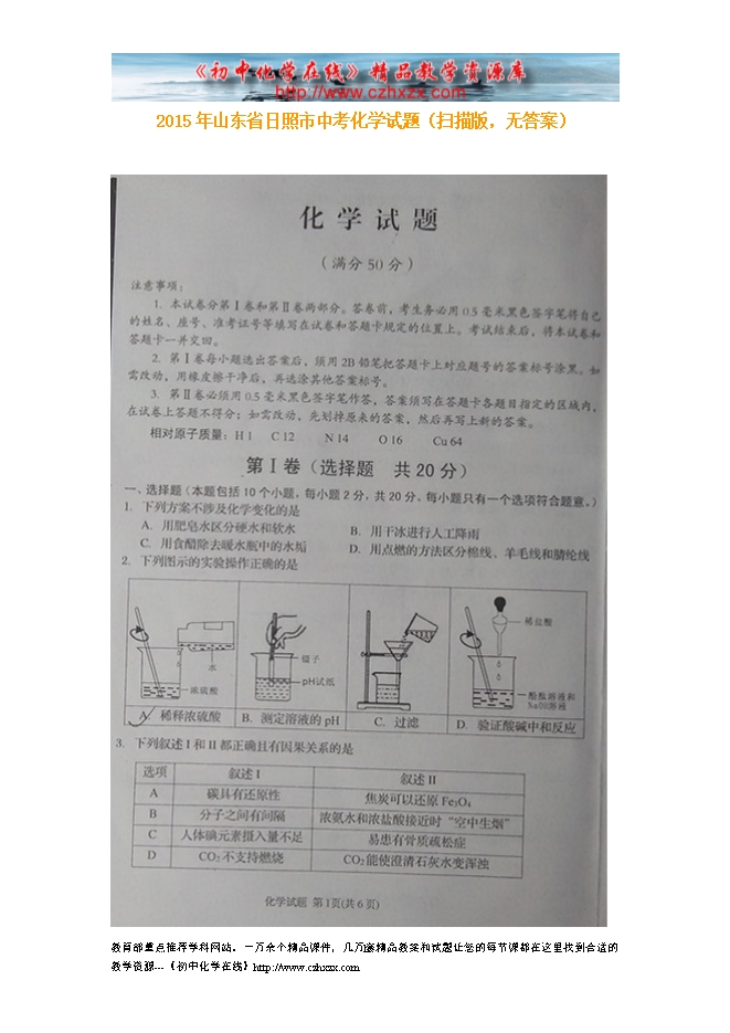 2015年山东省日照市中考化学试题(扫描版,无答案)