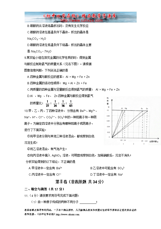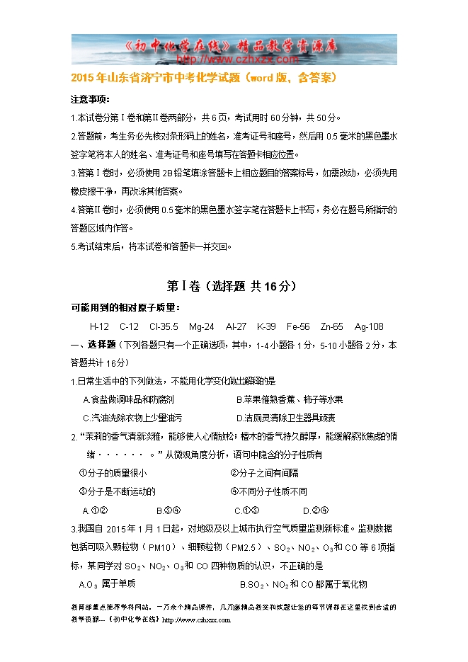 2015年山东省济宁市中考化学试题(word版,含答案)