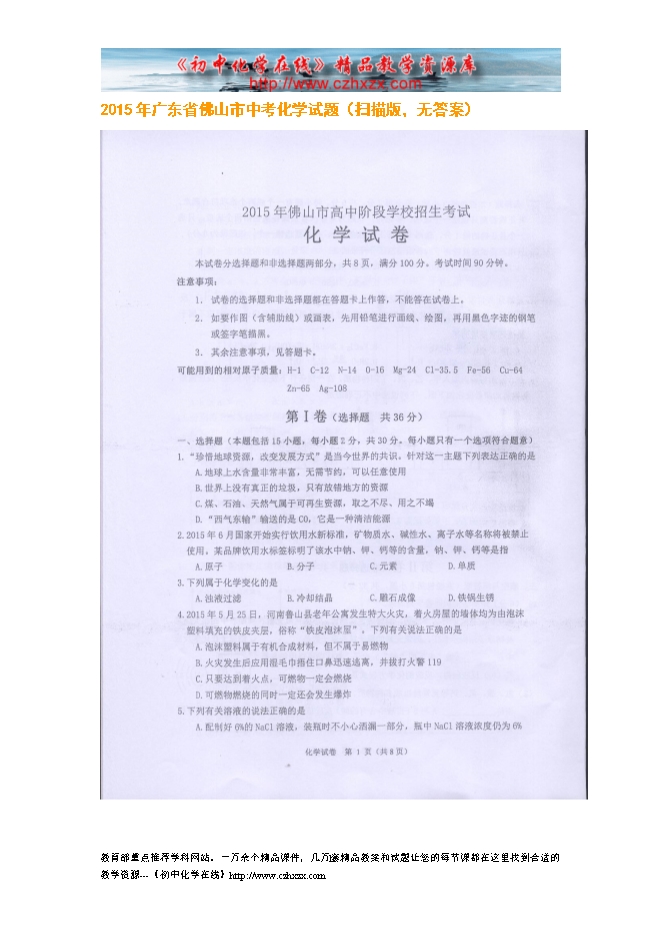 2015年广东省佛山市中考化学试题(扫描版,无答案)