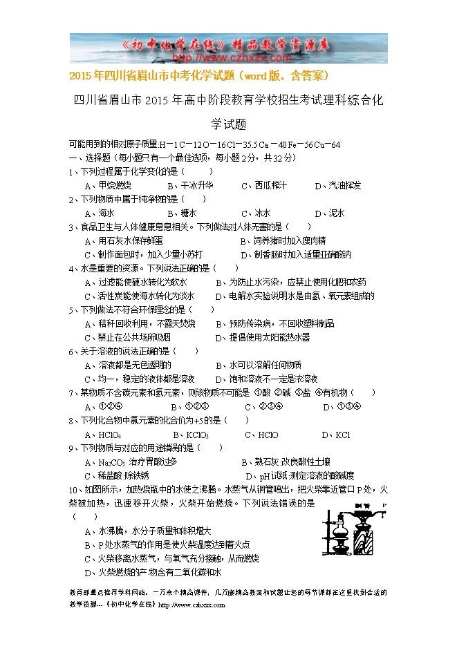 2015年四川省眉山市中考化学试题(word版,含答案)
