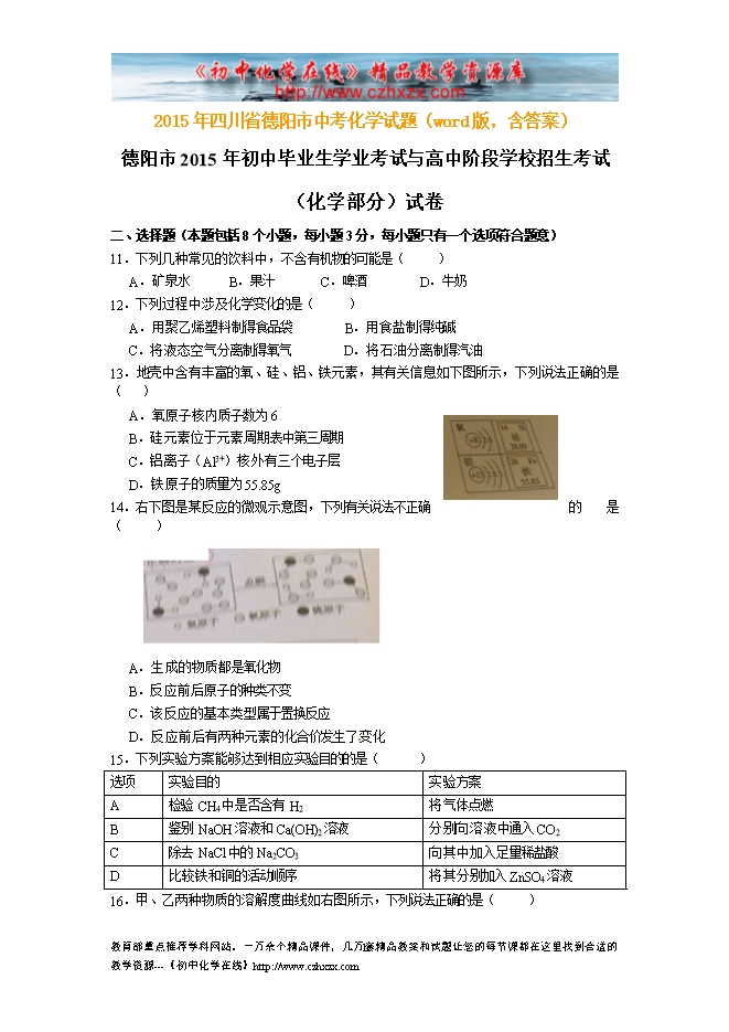 2015年四川省德阳市中考化学试题(word版,含答案)