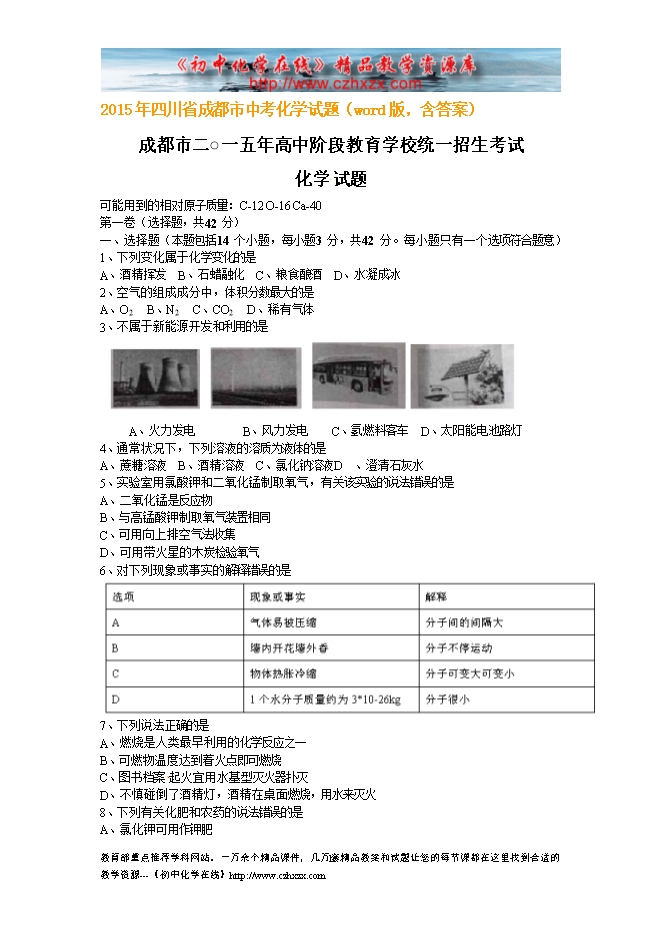2015年四川省成都市中考化学试题(word版,含答案)