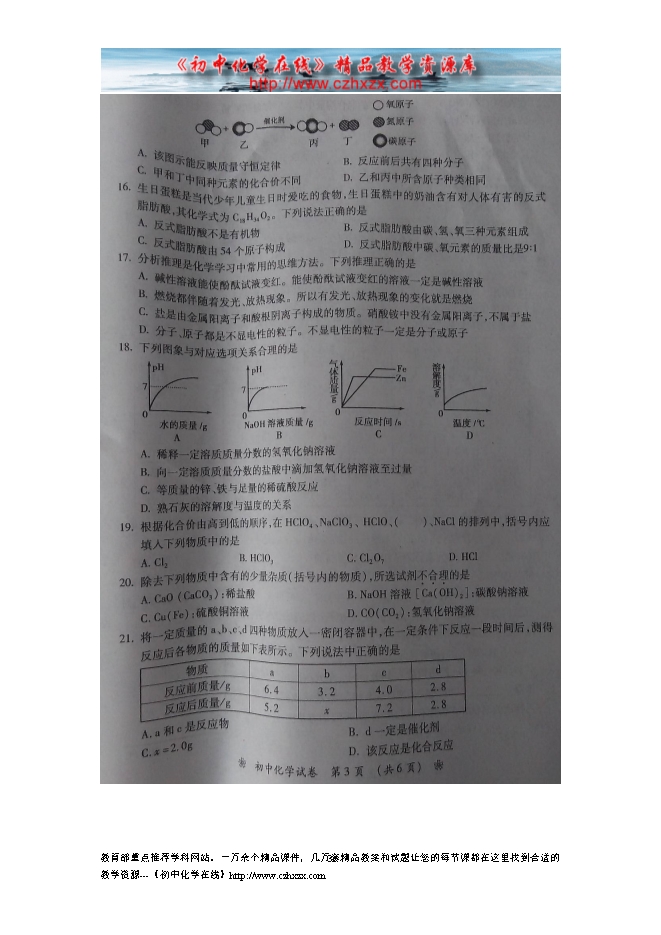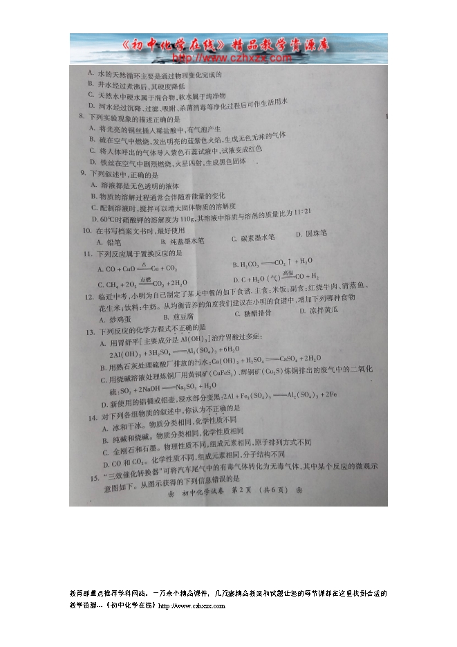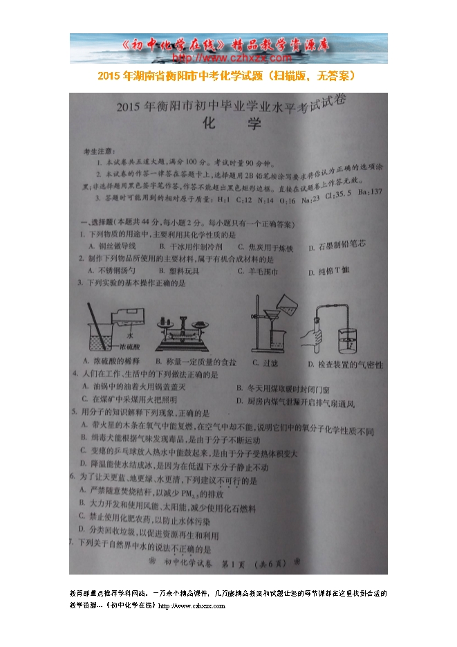 2015年湖南省衡阳市中考化学试题(扫描版,无答案)