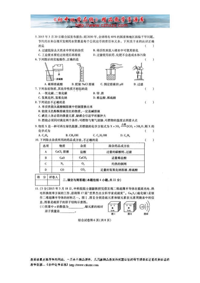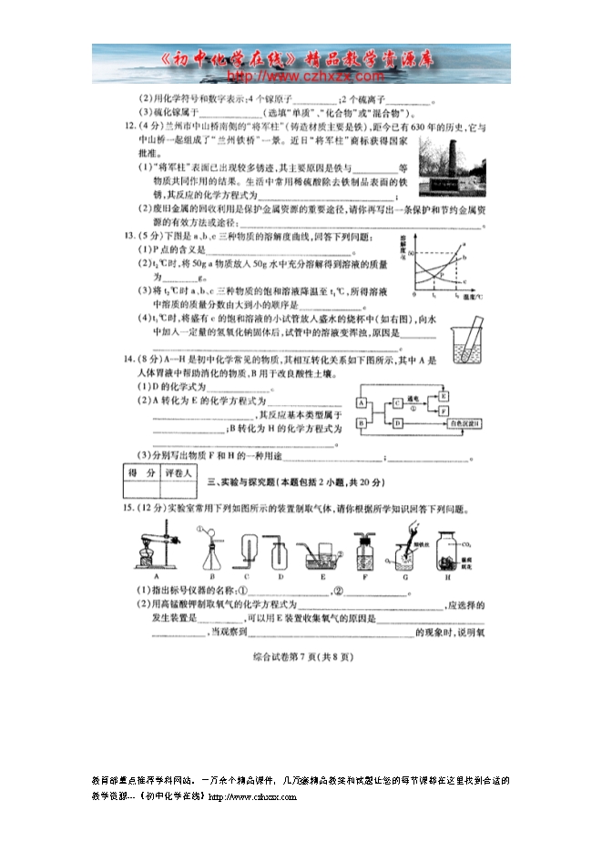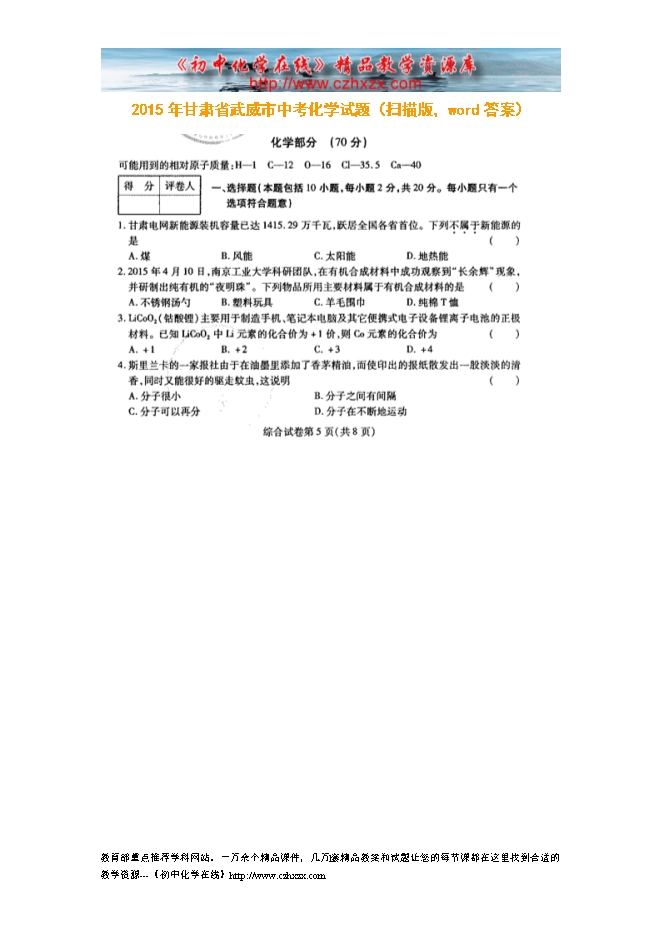 2015年甘肃省武威市中考化学试题(扫描版,word答案)