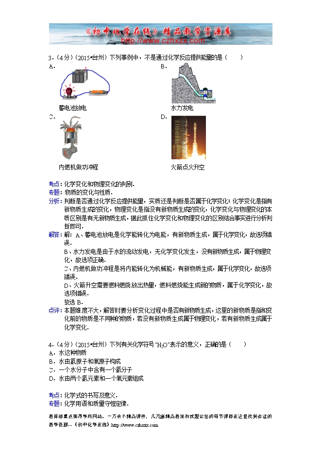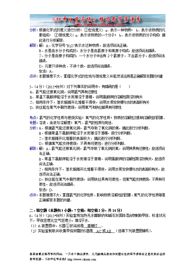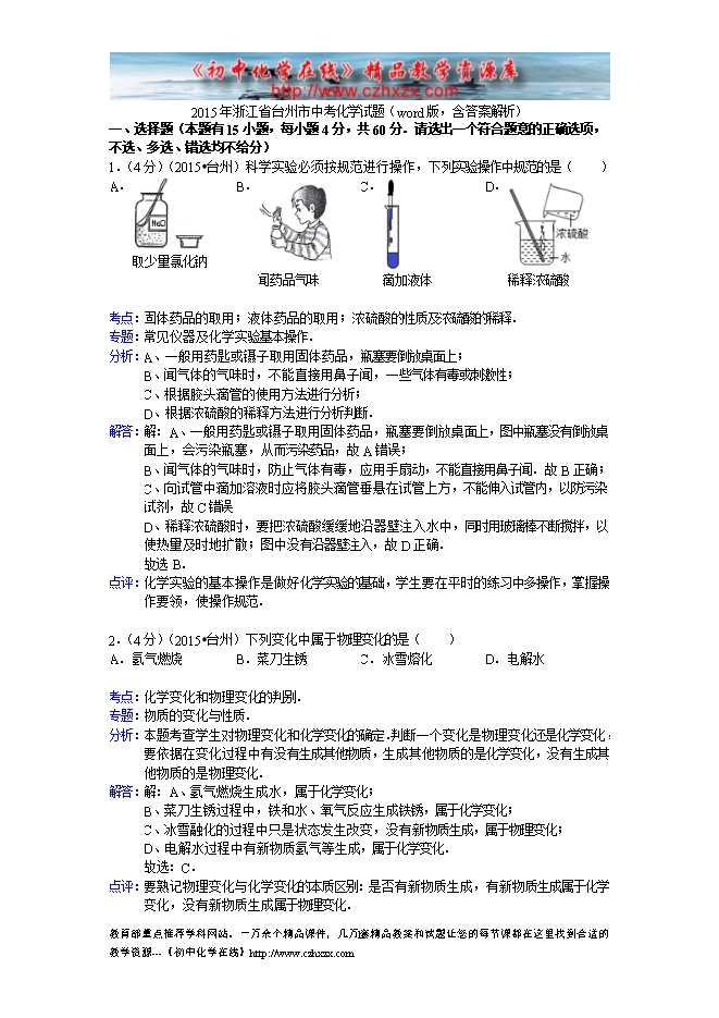 2015年浙江省台州市中考化学试题(word版,含答案解析)