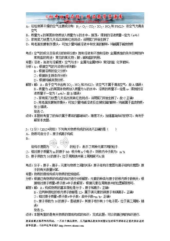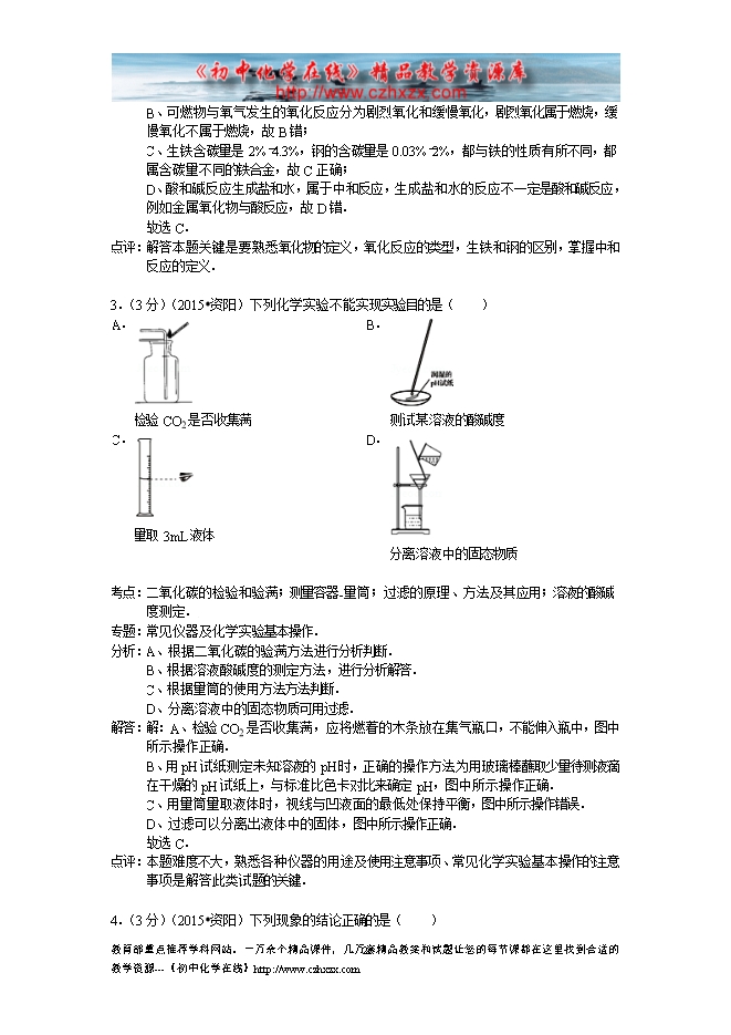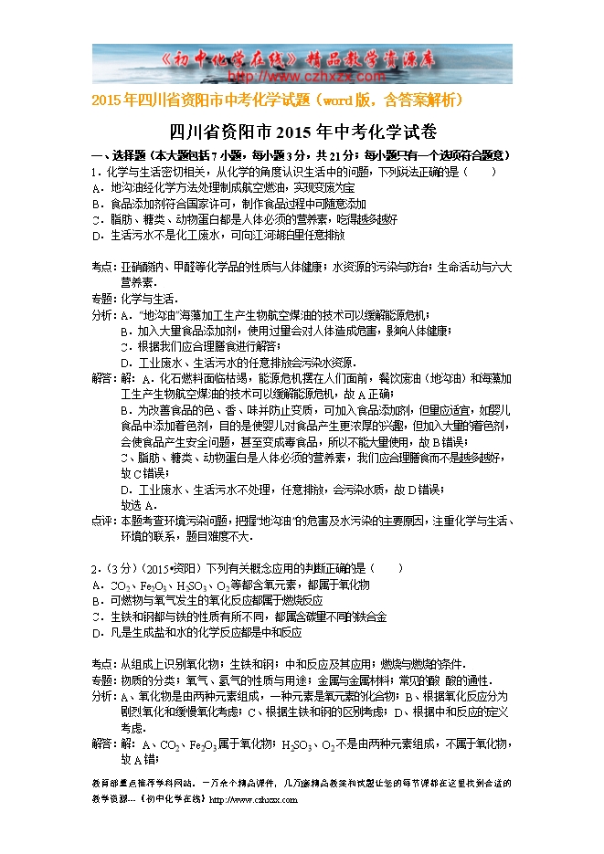 2015年四川省资阳市中考化学试题(word版,含答案解析)