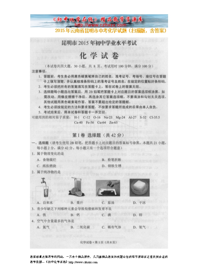 2015年云南省昆明市中考化学试题(扫描版,含答案)