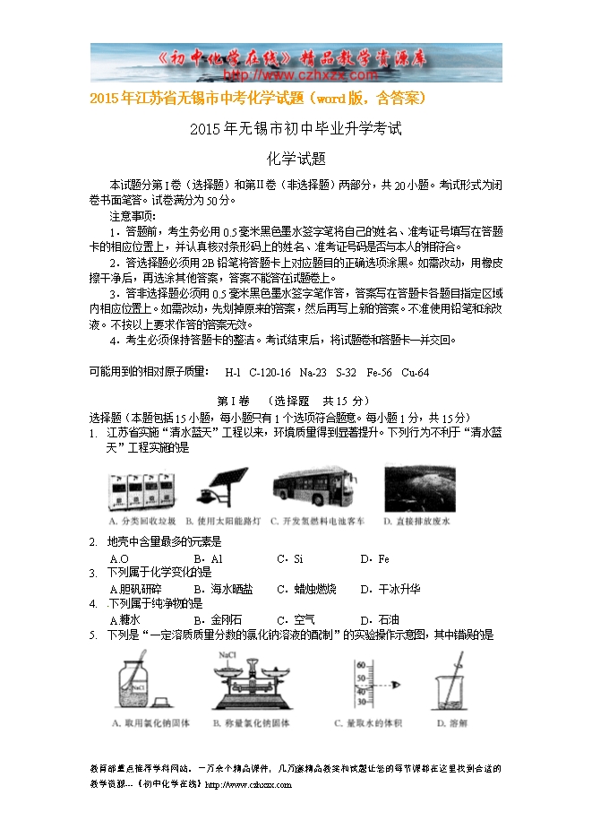 2015年江苏省无锡市中考化学试题(word版,含答案)