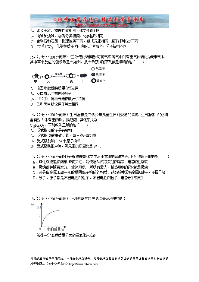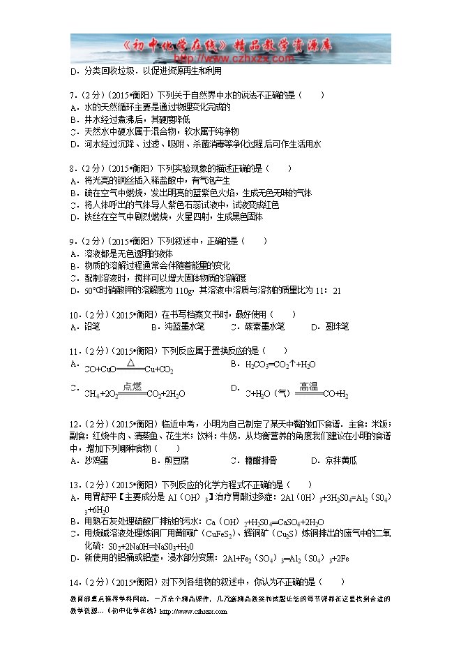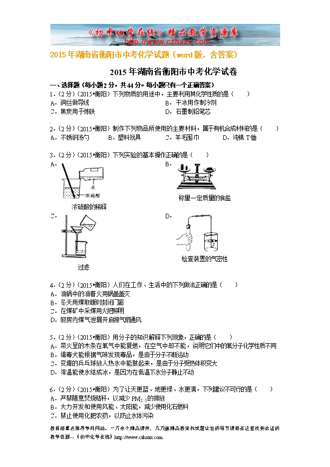 2015年湖南省衡阳市中考化学试题(word版,含答案)