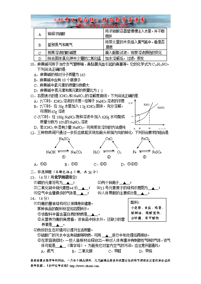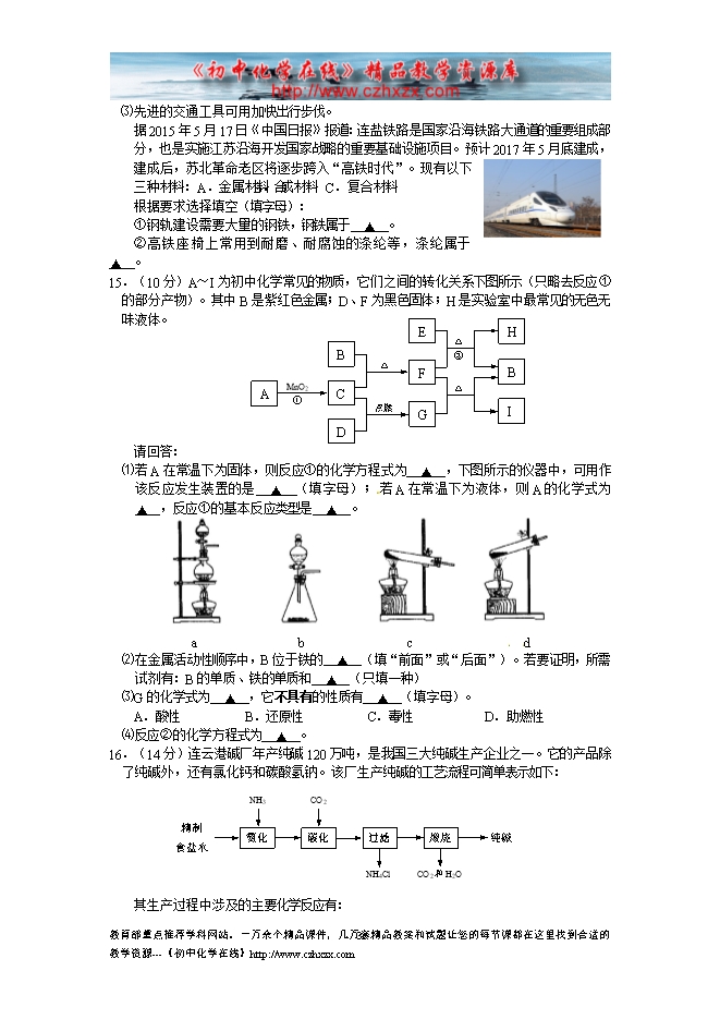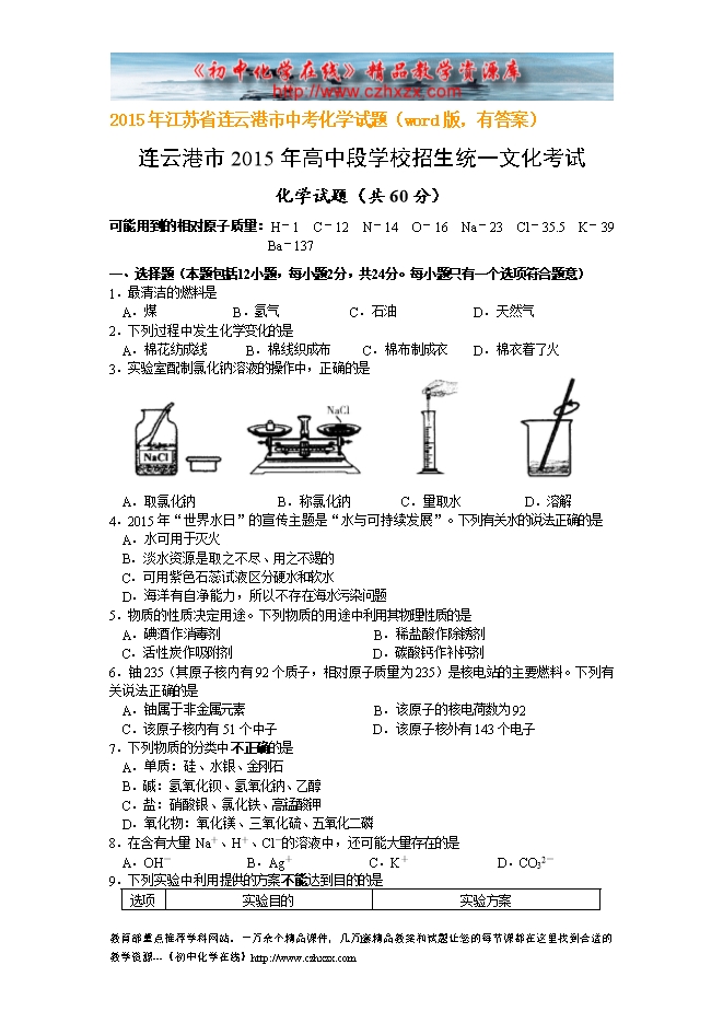 2015年江苏省连云港市中考化学试题(word版,有答案)