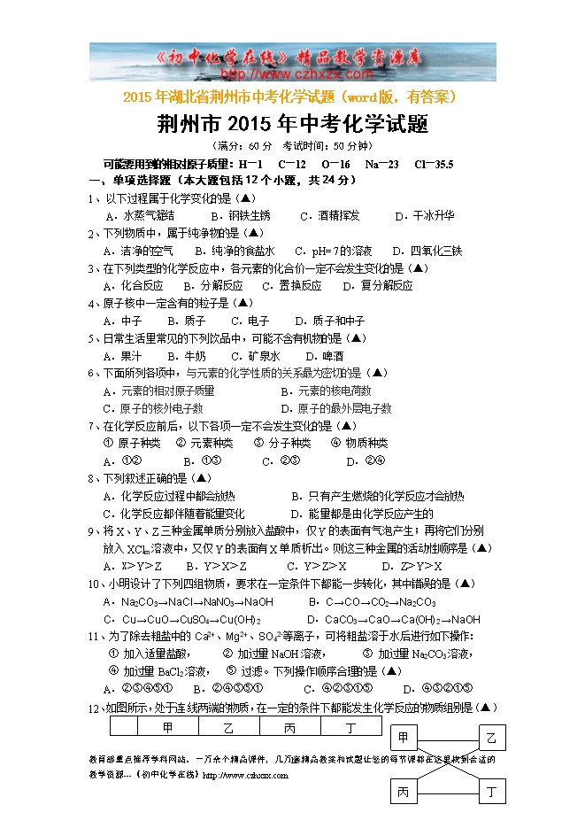 2015年湖北省荆州市中考化学试题(word版,有答案)