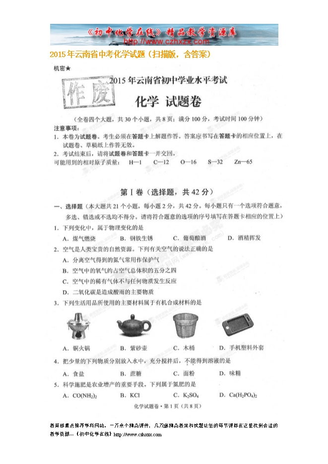 2015年云南省中考化学试题(扫描版,含答案)