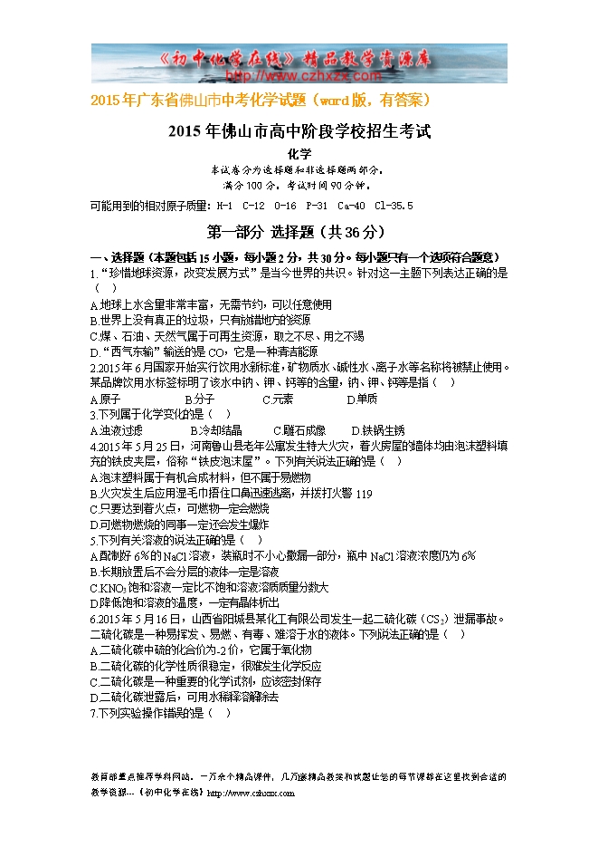 2015年广东省佛山市中考化学试题(word版,有答案)