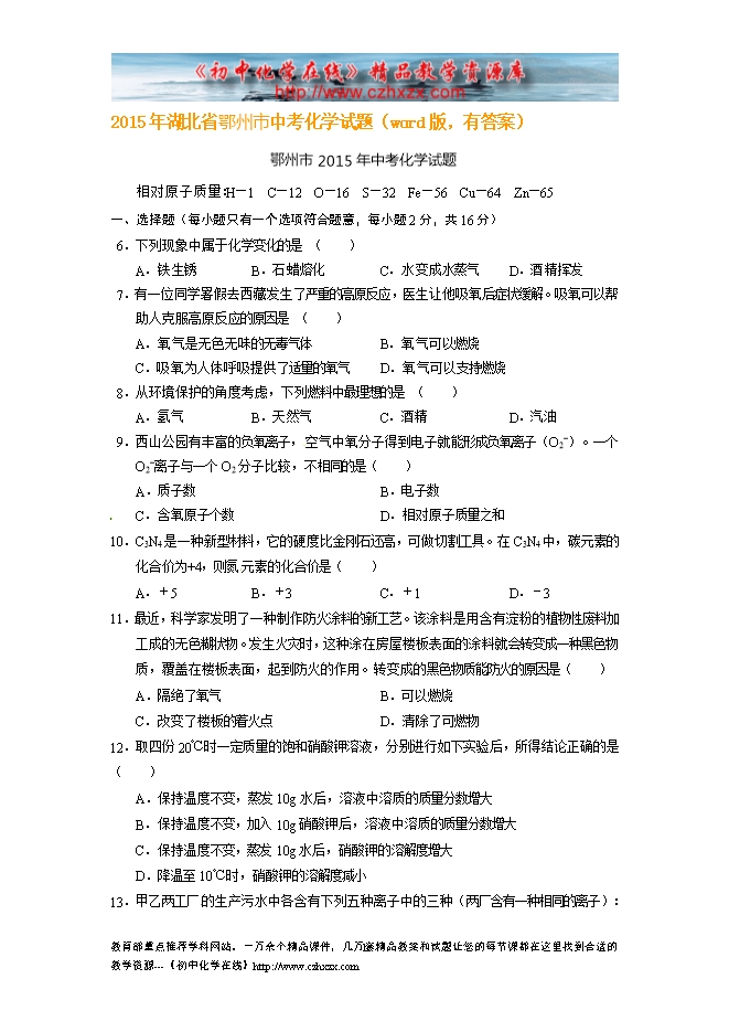 2015年湖北省鄂州市中考化学试题(word版,有答案)