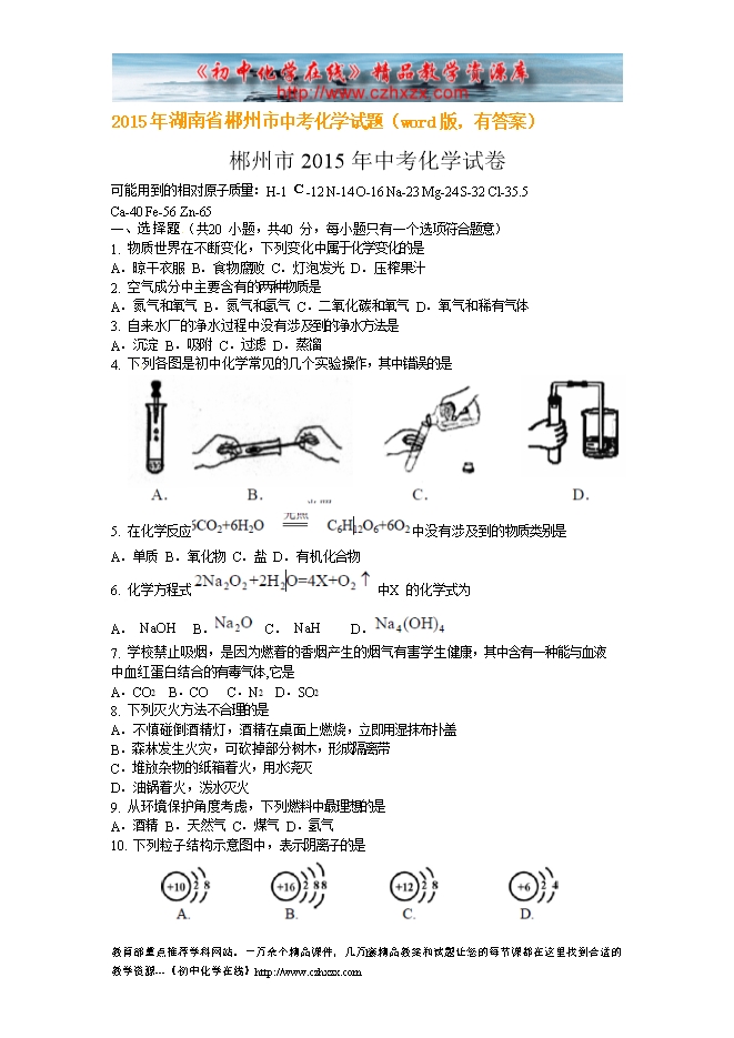 2015年湖南省郴州市中考化学试题(word版,有答案)