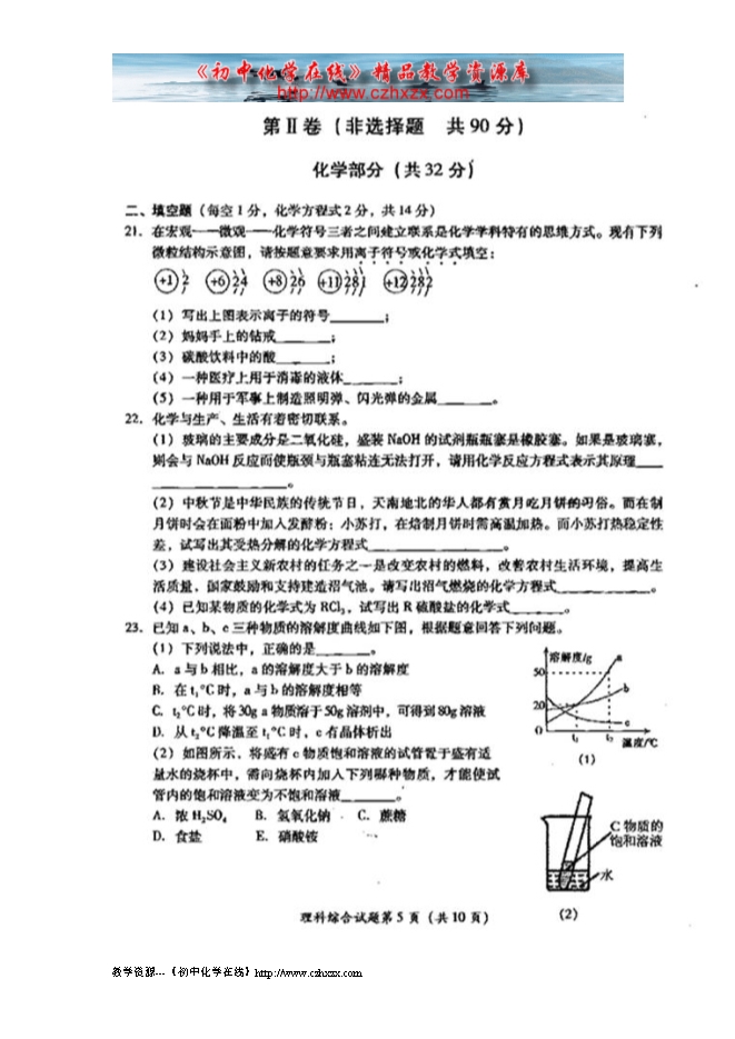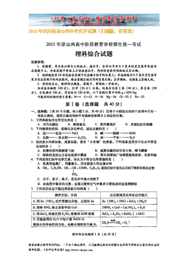 2015年四川省凉山州中考化学试题(扫描版,有答案)