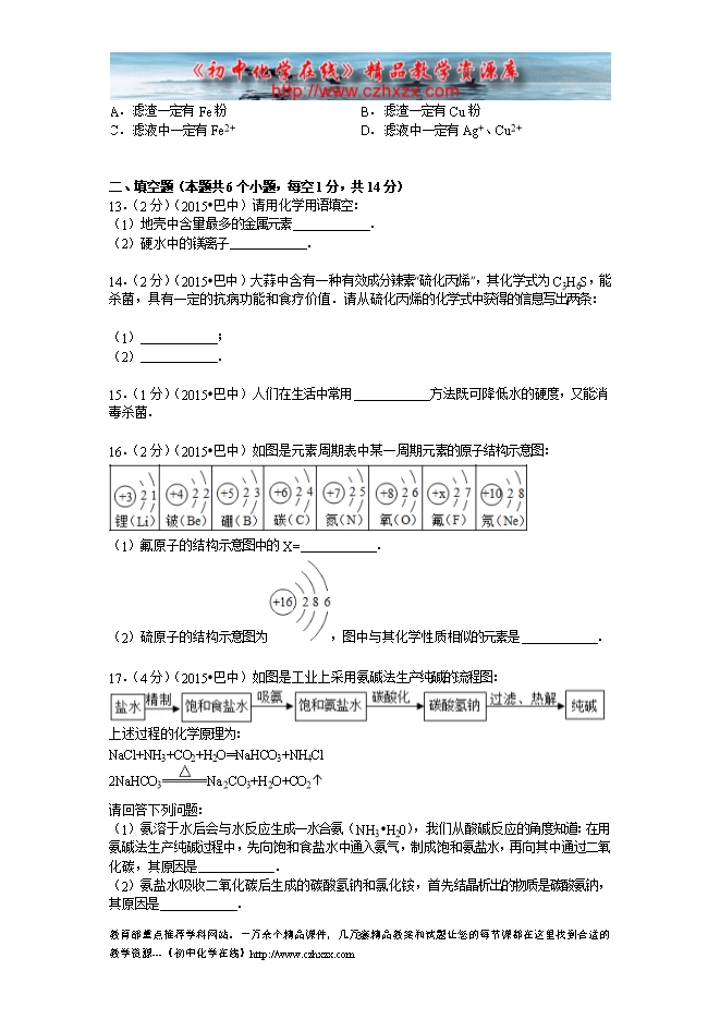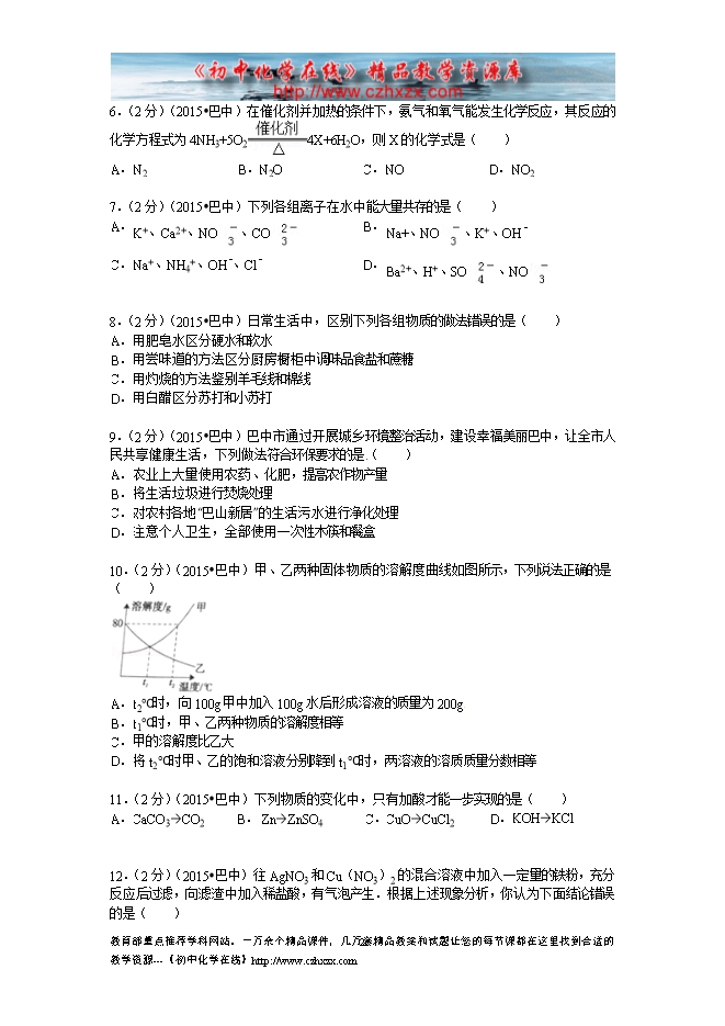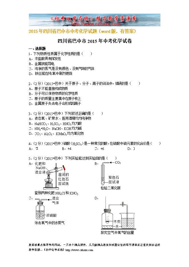 2015年四川省巴中市中考化学试题(word版,有答案)