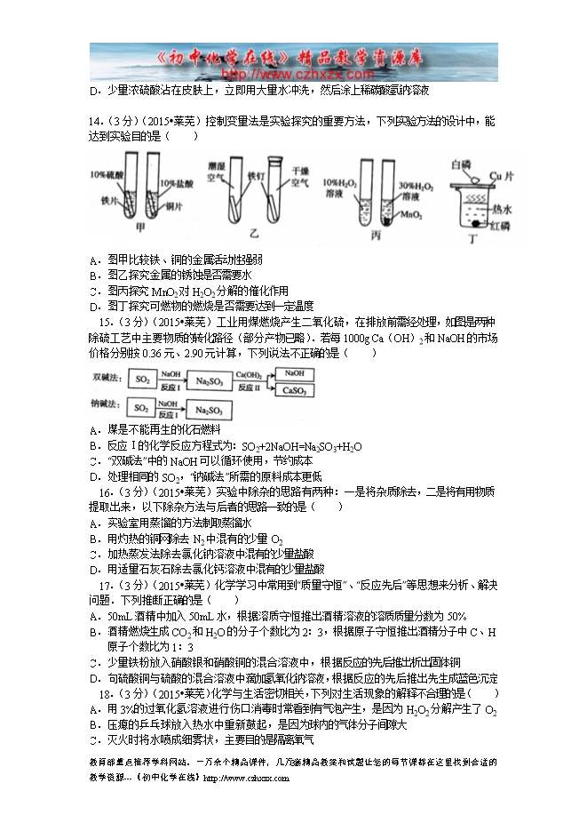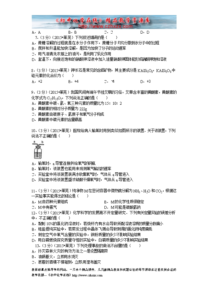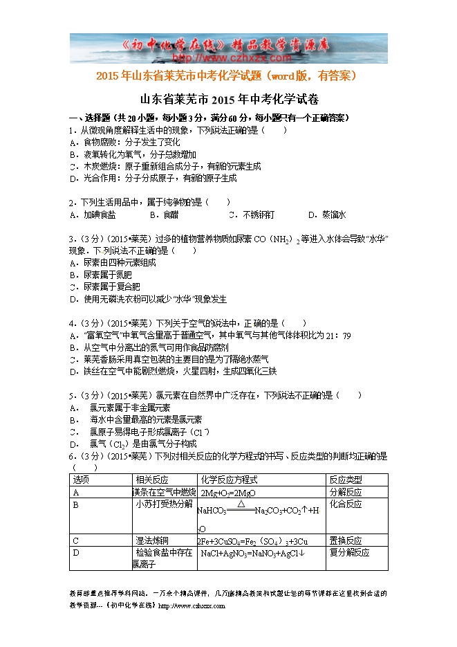 2015年山东省莱芜市中考化学试题(word版,有答案)