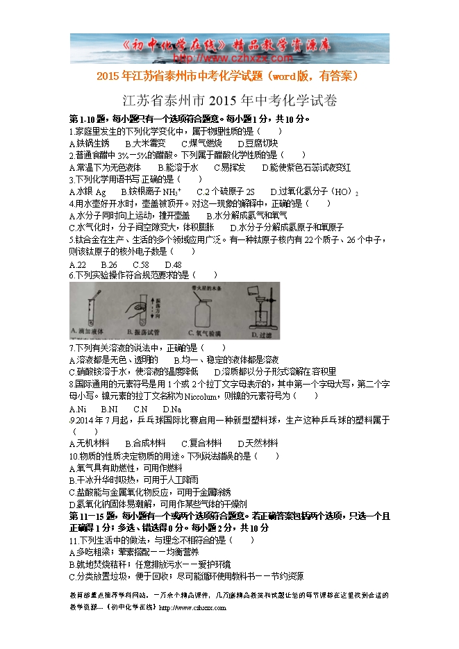 2015年江苏省泰州市中考化学试题(word版,有答案)
