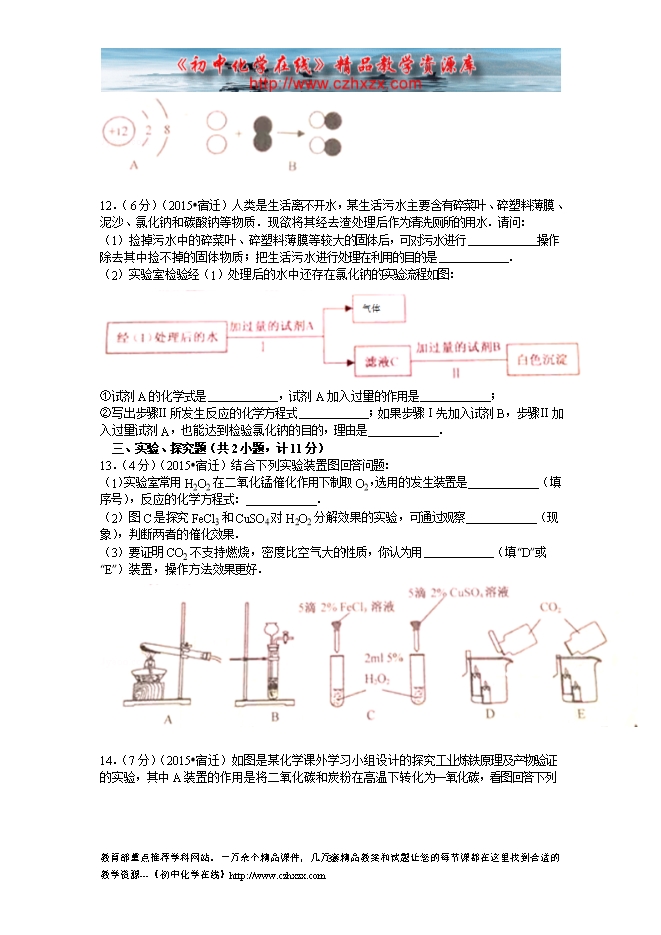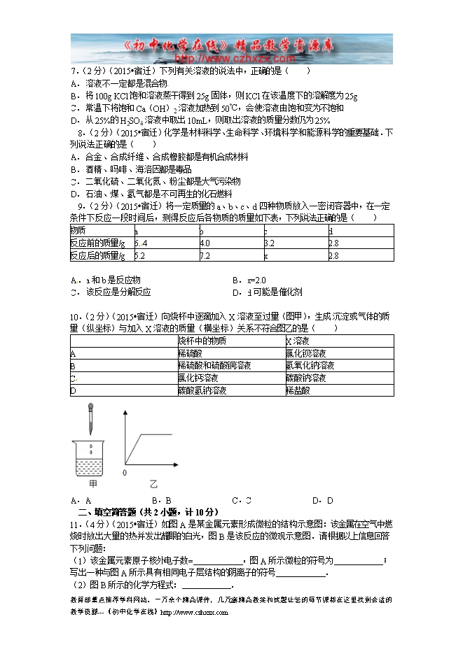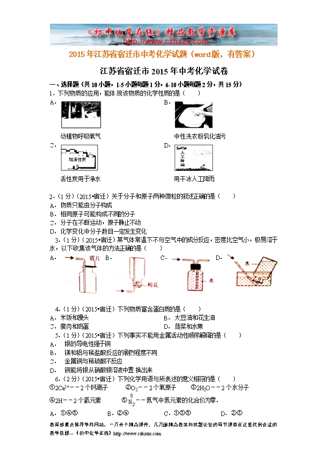 2015年江苏省宿迁市中考化学试题(word版,有答案)