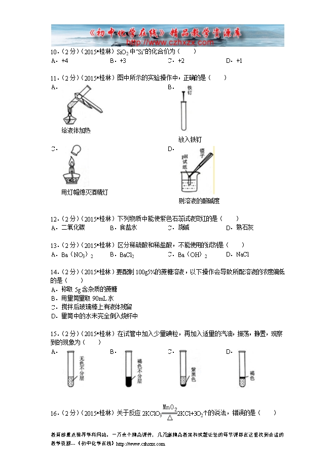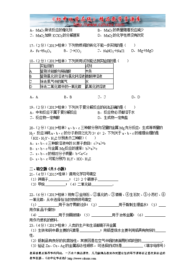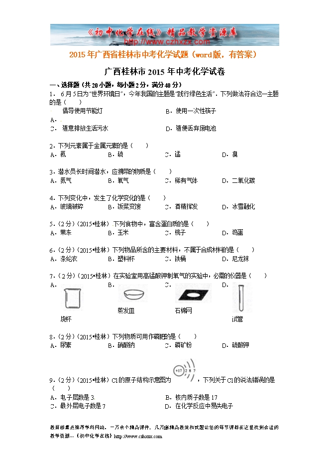 2015年广西省桂林市中考化学试题(word版,有答案)