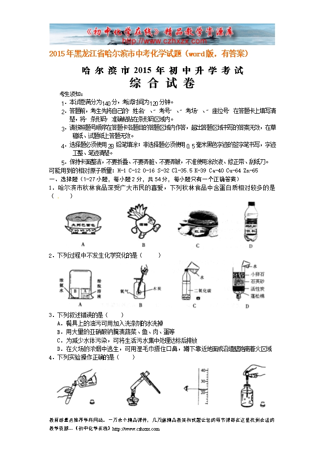 2015年黑龙江省哈尔滨市中考化学试题(word版,有答案)