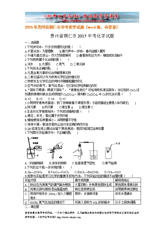 2015年贵州省铜仁市中考化学试题(word版,有答案)
