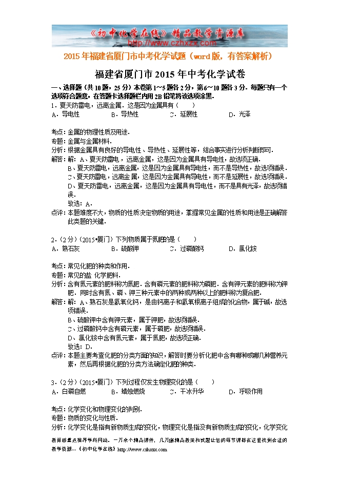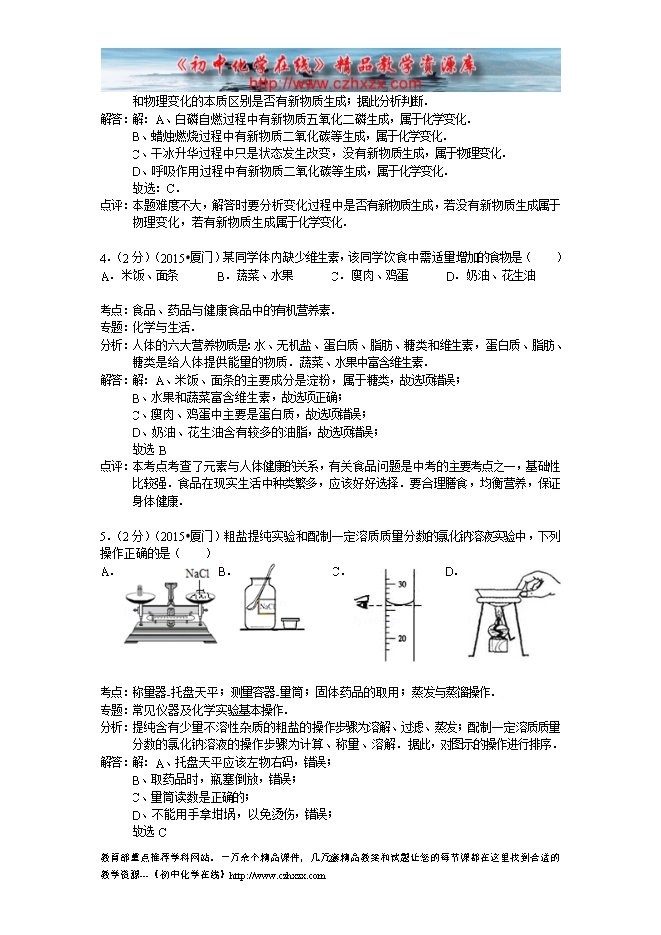 2015年福建省厦门市中考化学试题(word版,有答案解析)