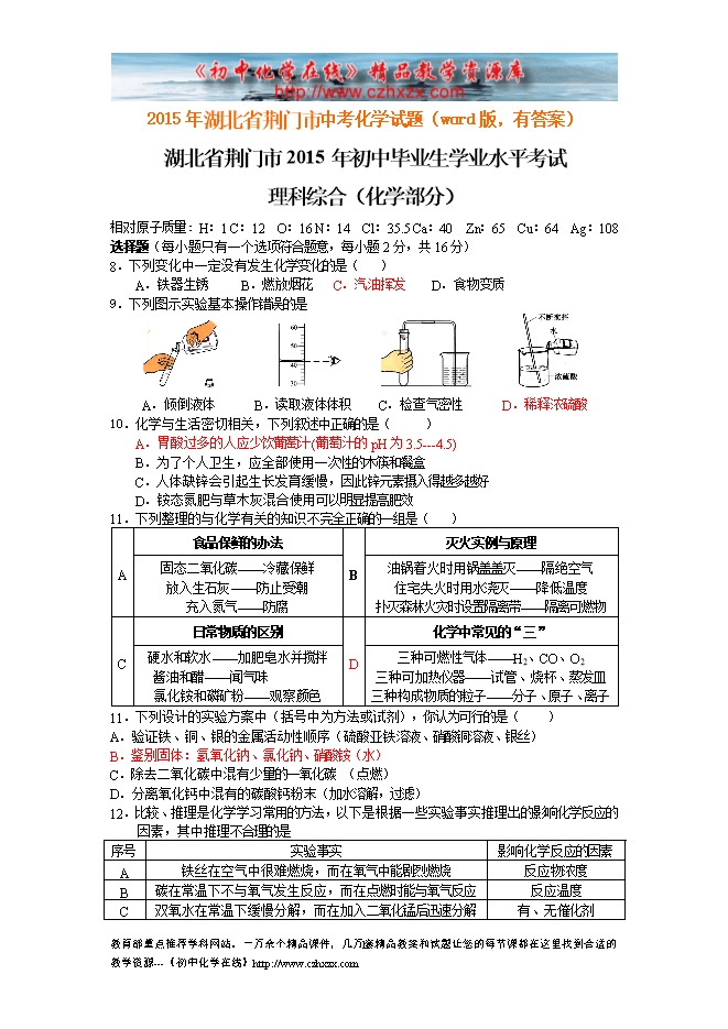 2015年湖北省荆门市中考化学试题(word版,有答案)
