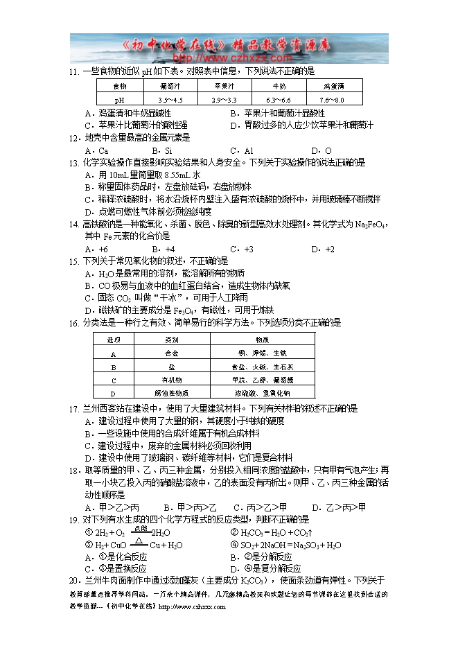 2015年甘肃省兰州市中考化学试题(word版,无答案)