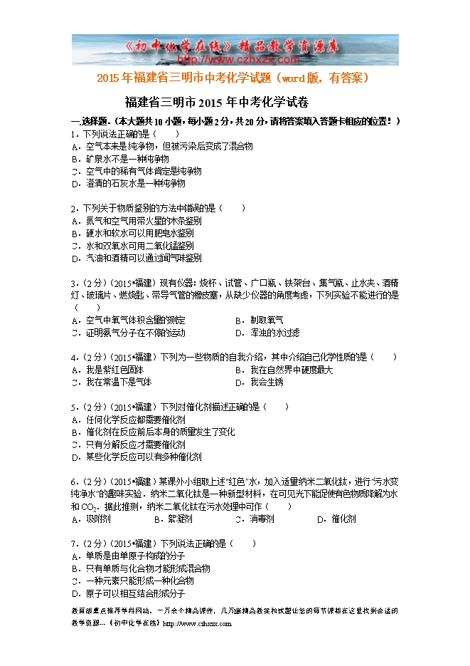 2015年福建省三明市中考化学试题(word版,有答案)