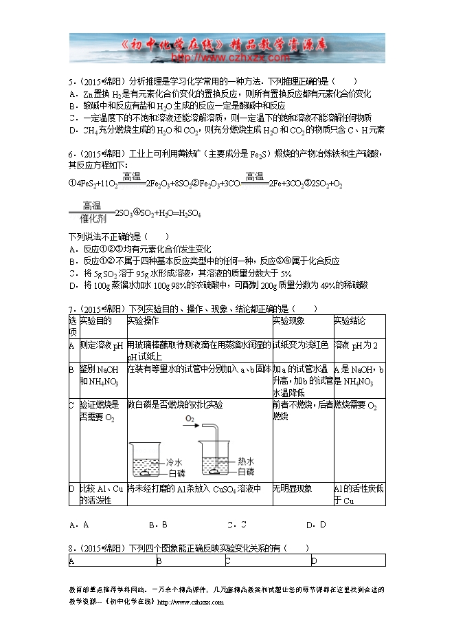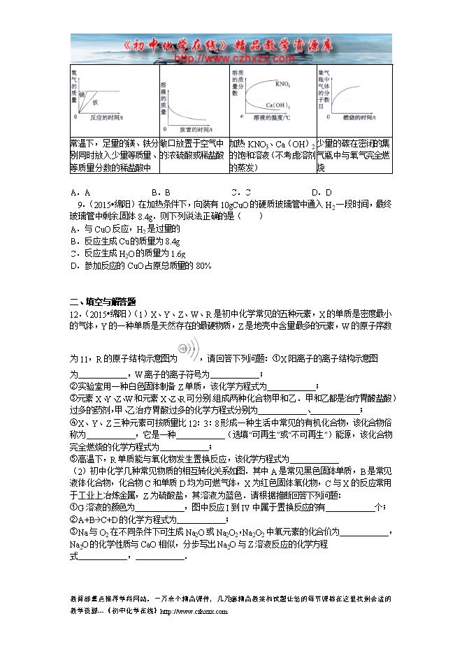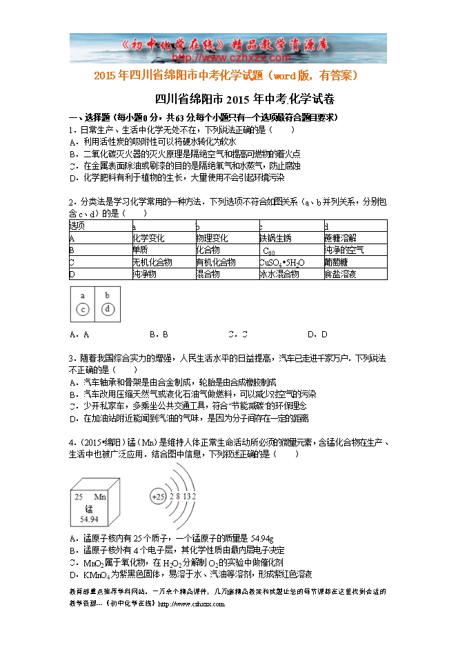 2015年四川省绵阳市中考化学试题(word版,有答案)