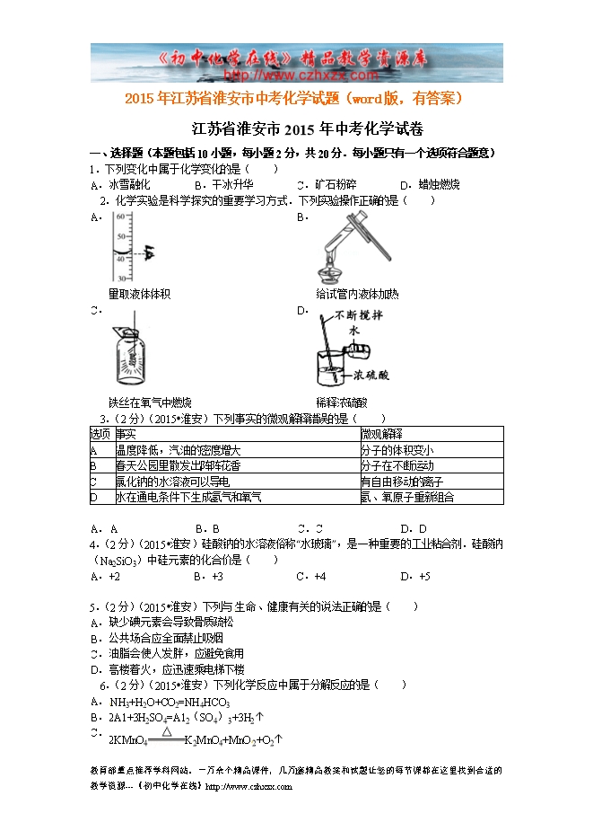 2015年江苏省淮安市中考化学试题(word版,有答案)