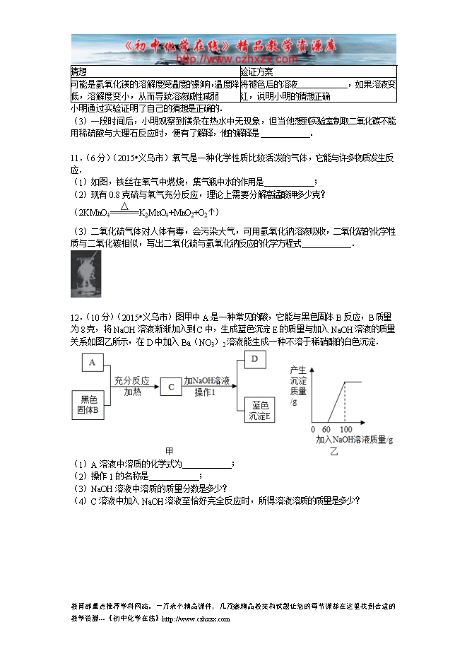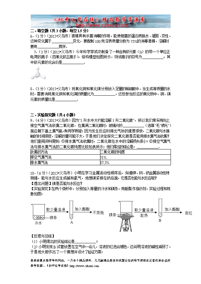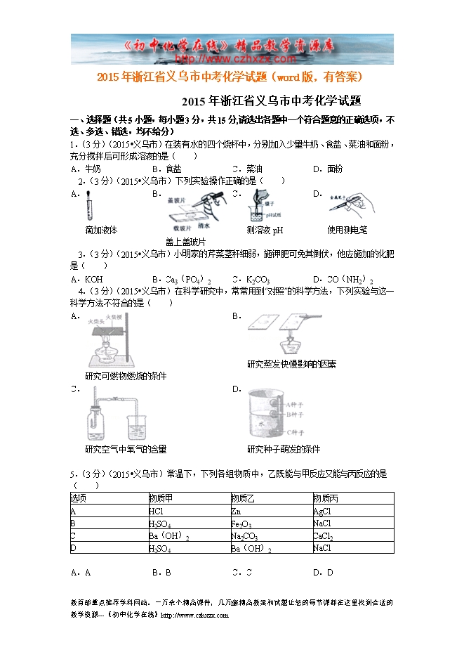 2015年浙江省义乌市中考化学试题(word版,有答案)