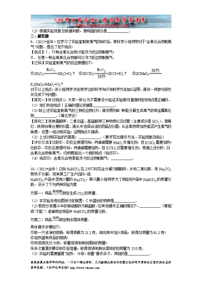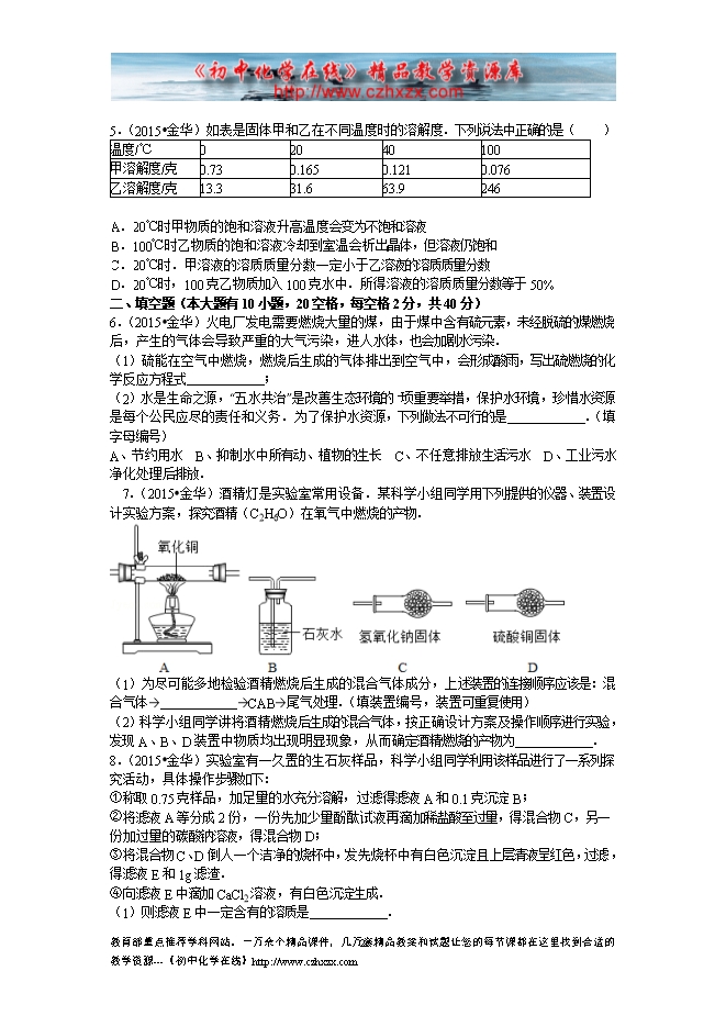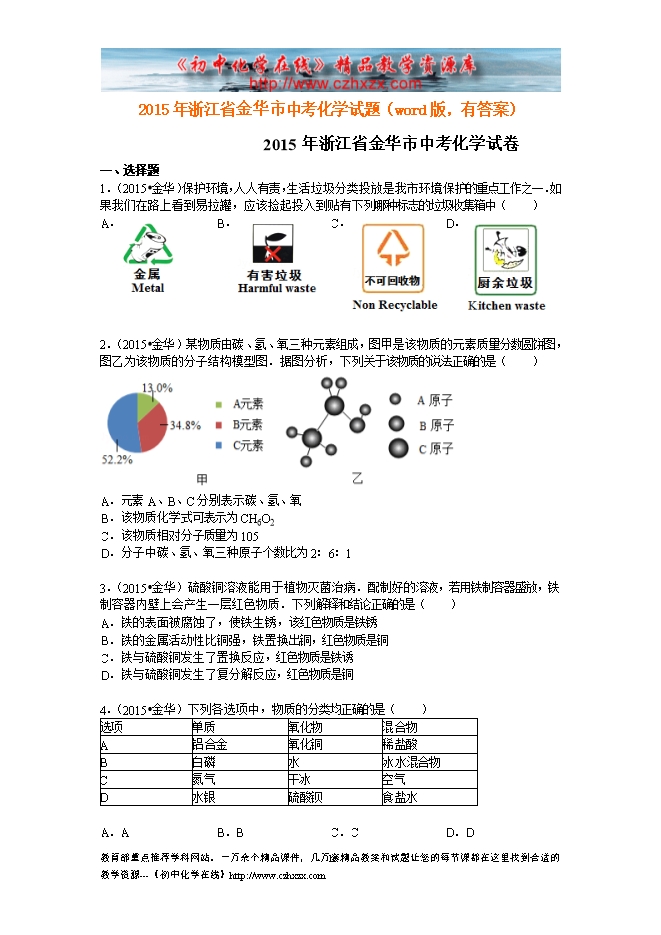 2015年浙江省金华市中考化学试题(word版,有答案)
