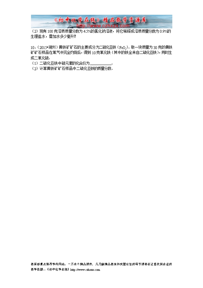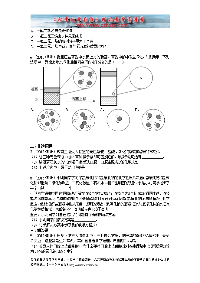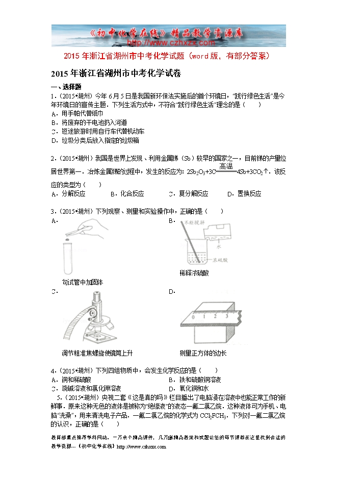 2015年浙江省湖州市中考化学试题(word版,有部分答案)
