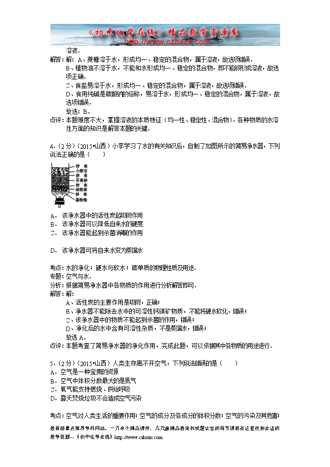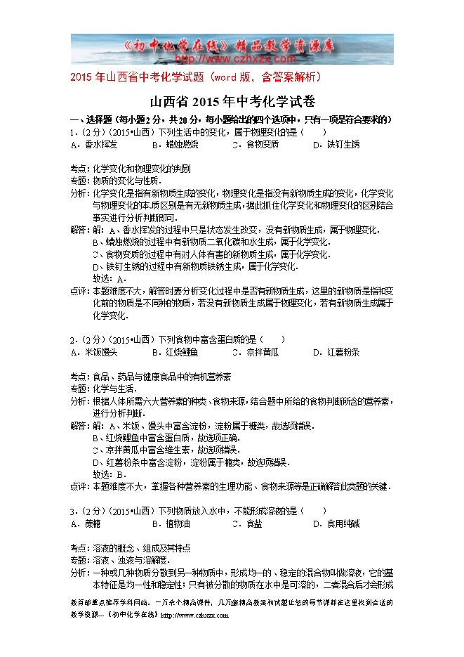 2015年山西省中考化学试题(word版,含答案解析)
