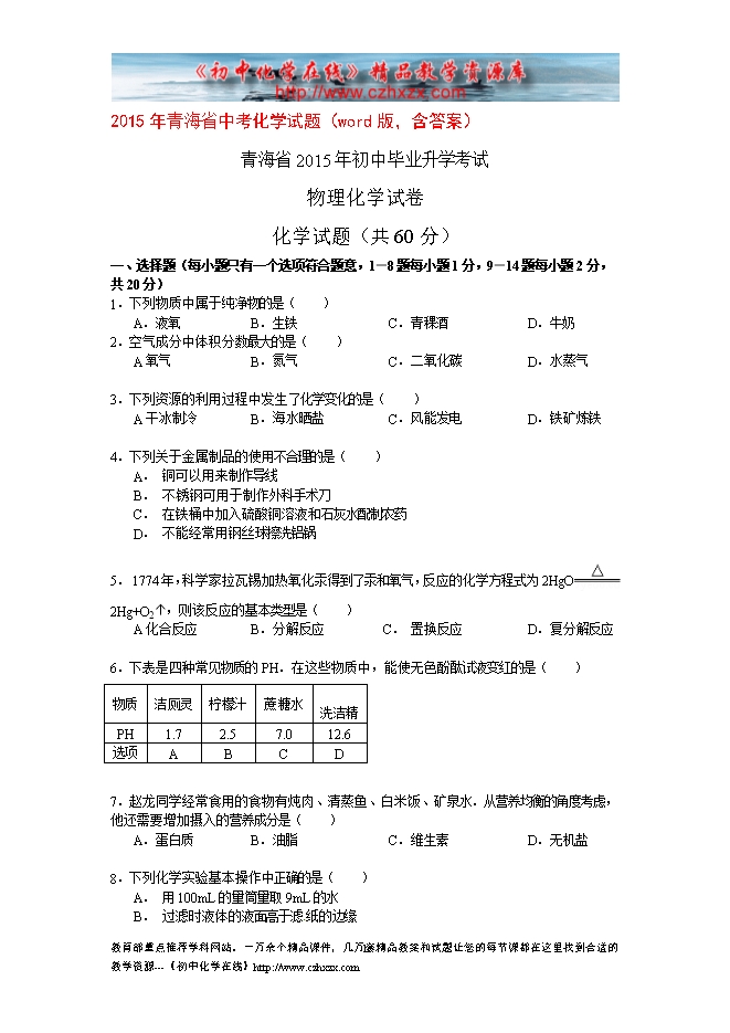所属专辑: 《2015年各省市中考化学真题》专辑