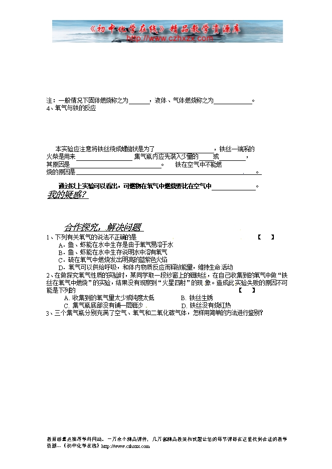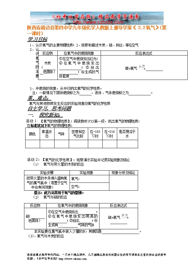 陕西省靖边县第四中学九年级化学人教版上册导学案《 2.2氧气》(第一课时)